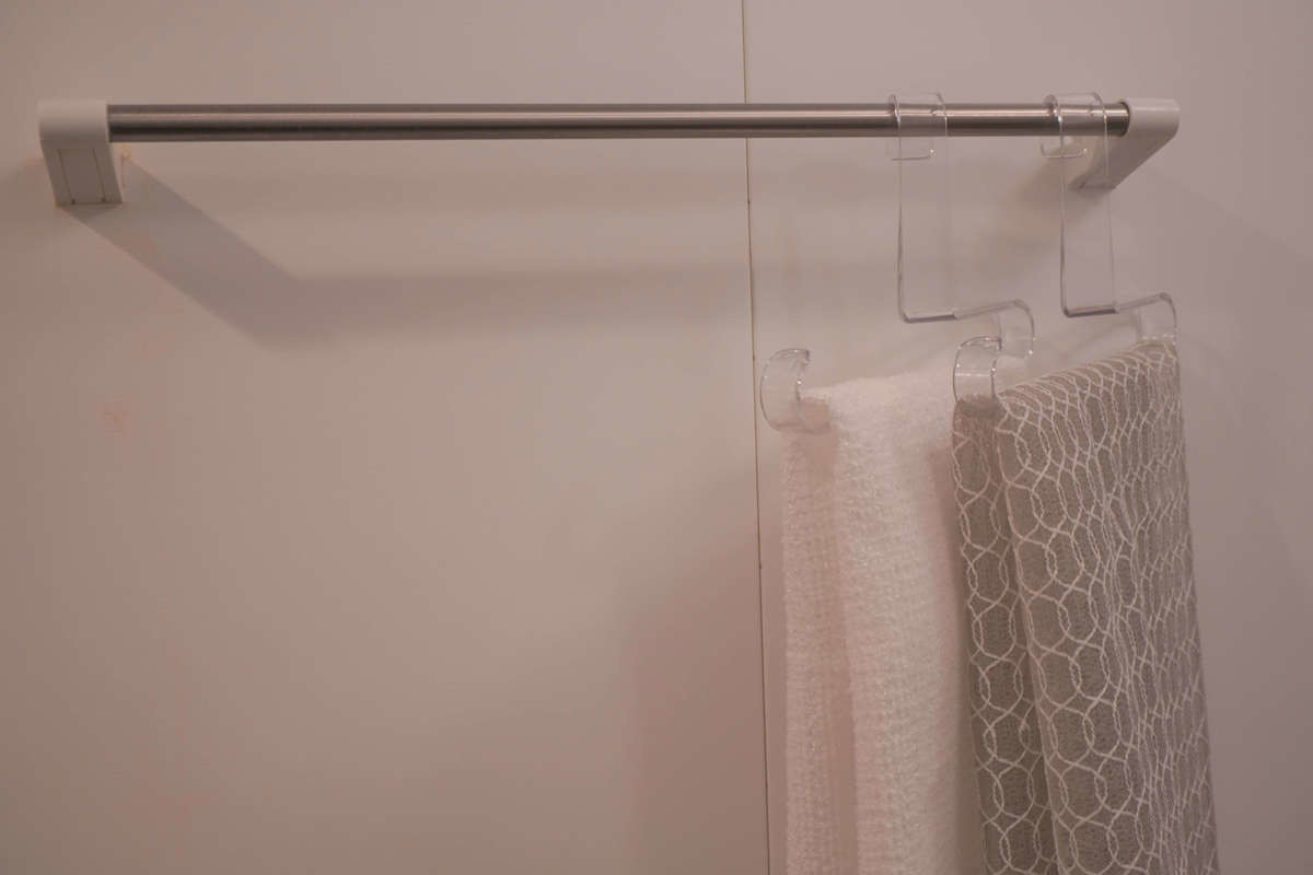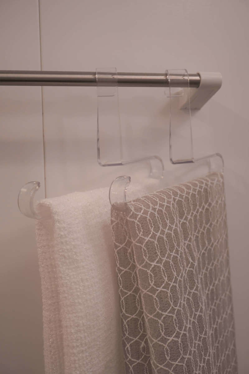 ハンガーにかけてボデイタオルをバーに吊るすとこのようになり、バーの使えるスペースが大幅に増えました!