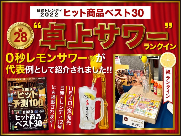 「0秒レモンサワー® 仙台ホルモン焼肉酒場 ときわ亭」がブームの火付け役の「卓上サーバー」が日経トレンディ「2022年ヒット商品ベスト30 」28位受賞! - PR TIMES