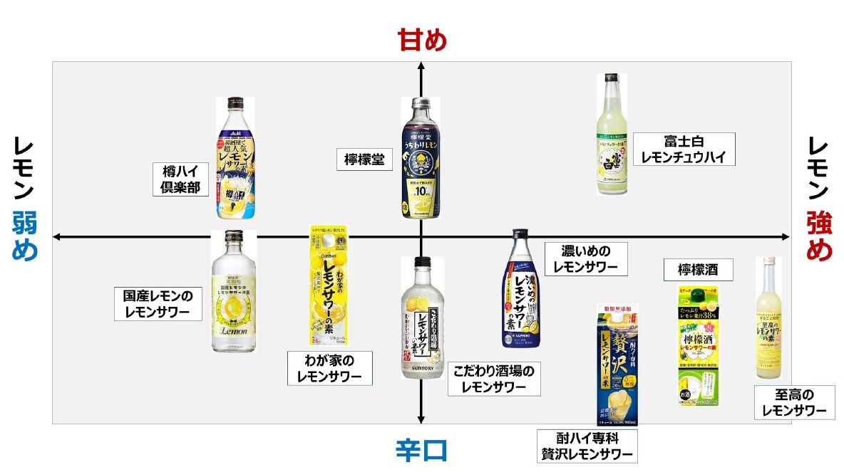 まずはこの2つの軸を意識して、「この領域が好きかも」というおぼろげな好みが見えてきたら、そのカテゴリーの中で好きなものを見つけていくのがおすすめです。レモンサワーの素をマッピングしてみたので、ぜひ有効活用してもらえればと思います。