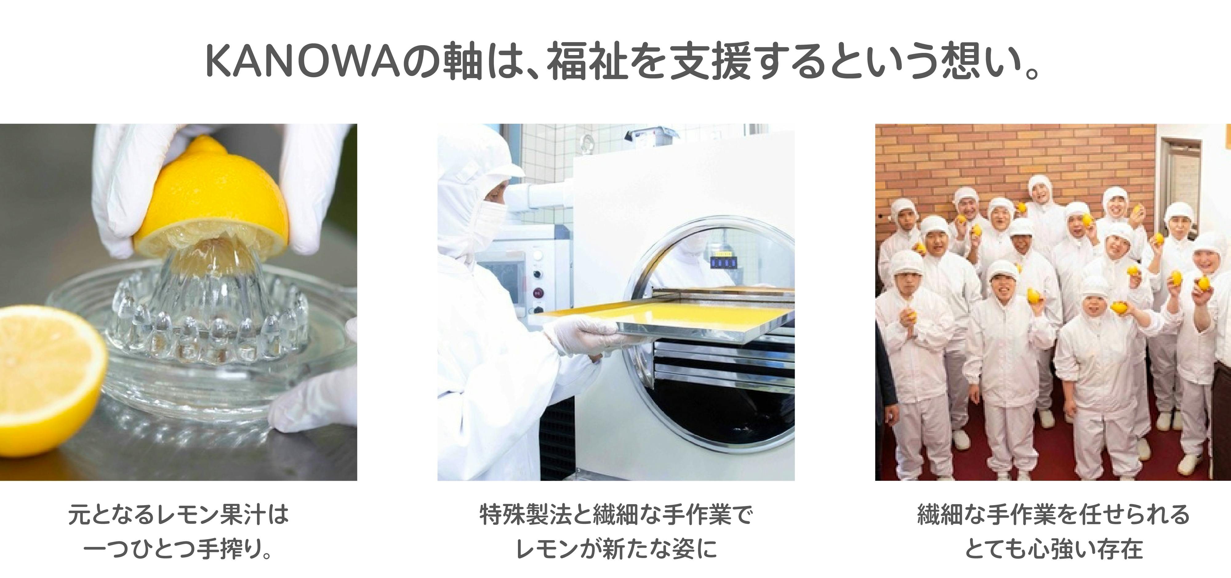 その後もさまざまなレモンケーキを企画してきましたが、私たちが一貫してこだわったのは、本格的な「レモン」そのものをケーキで伝えること。kanowaの商品は、生産者さんから直接レモンを仕入れ、障がい福祉事業所で濃縮や搾汁、粉末化などの加工を行っています。余計なものは入れず、レモン本来の味をしっかりと伝えるシェフのレシピにより、しっかりと素材の味で勝負できるものができたと自負しています。
