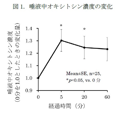 ②摂取前と摂取から5, 20, 60分後に唾液採取し、唾液中オキシトシン濃度の変化を調べました。