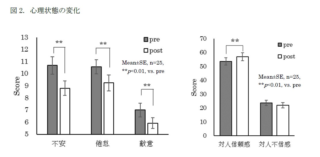 その結果、摂取から5, 20分後に、摂取前と比較して唾液中のオキシトシン濃度が有意に高くなることがわかりました(図1)。また、質問紙では、摂取前後で否定的な感情項目の「不安」「倦怠」「敵意」が有意に低下、「対人信頼感」が有意に上昇することがわかりました(図2)。